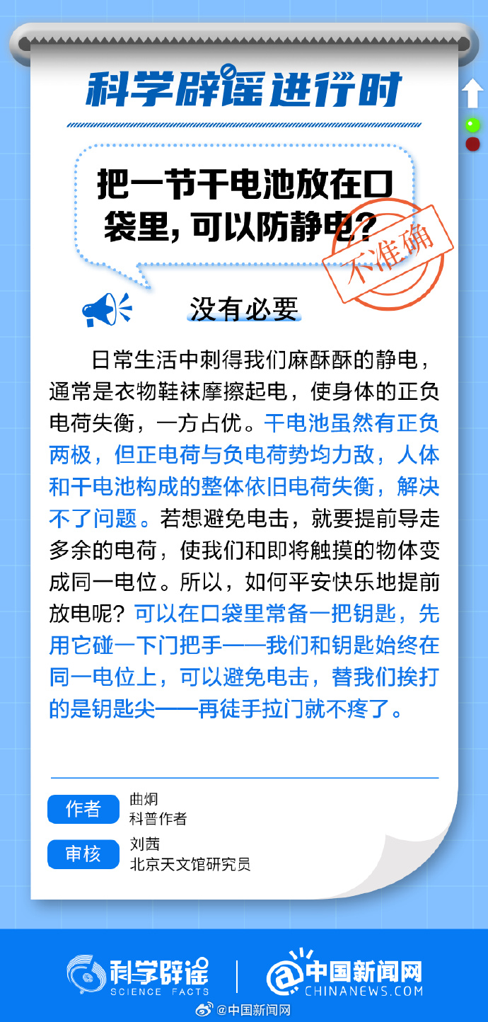 中新網(wǎng)1月11日電 干電池雖然有正負兩極,但正電荷與負電荷勢均力敵,人體和干電池構(gòu)成的整體依舊電荷失衡,解決不了問題。若想避免電擊,就要提前導走多余的電荷,使我們和即將觸摸的物體變成同一電位。所以,如何平安快樂地提前放電呢? 可以在口袋里常備一把鑰匙,先用它碰一下門把手。(來源:@科學辟謠 中國新聞網(wǎng))