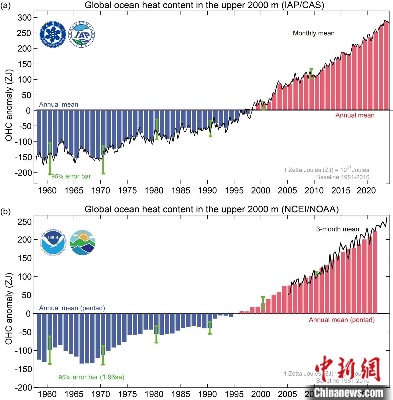 1958-2023年全球海洋上層2000米熱含量變化時(shí)間序列:上圖為IAP/CAS數(shù)據(jù);下圖為NOAA/NCEI數(shù)據(jù)。中國(guó)科學(xué)院大氣物理研究所/供圖