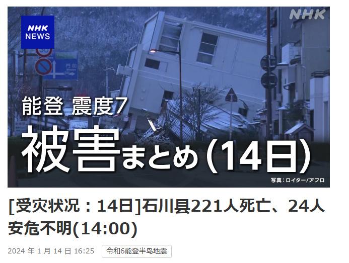 中新網(wǎng)1月14日電 據(jù)日本廣播協(xié)會(huì)(NHK)報(bào)道,日本石川縣最新統(tǒng)計(jì)數(shù)據(jù)顯示,截至當(dāng)?shù)貢r(shí)間14日下午2時(shí),日本石川縣能登地區(qū)1日發(fā)生的7.6級(jí)地震已造成221人遇難。