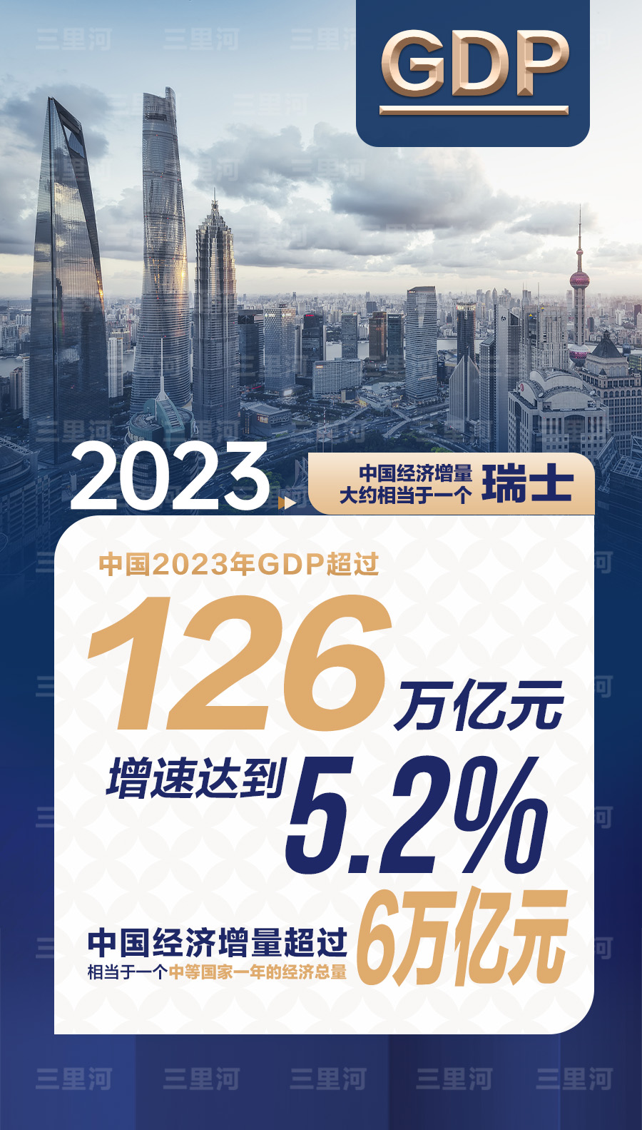2023年中國經(jīng)濟(jì)年報(bào)顯示,全年GDP超過126萬億元(人民幣,下同),增速達(dá)到5.2%。按照可比價(jià)計(jì)算,2023年中國經(jīng)濟(jì)增量超過6萬億元,相當(dāng)于一個(gè)中等國家一年的經(jīng)濟(jì)總量。