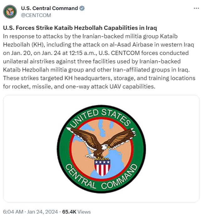 美國中央司令部23日也在聲明中稱,美軍對“真主黨旅”總部、武器儲存地點等進行了空襲。