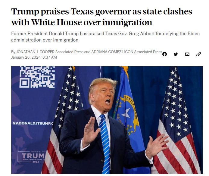 據(jù)報道,特朗普27日在一場以邊境安全為主要議題的演講中表示,應(yīng)全力支持得克薩斯州在美墨邊境采取的遏制非法移民的措施,并稱贊阿博特在該問題上采取的舉措。