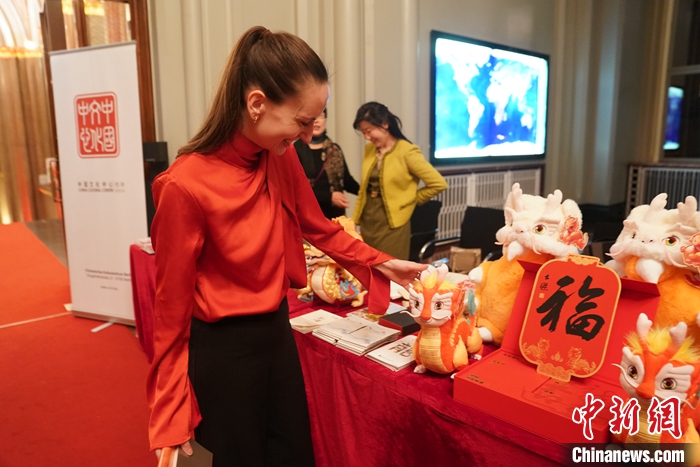 柏林中國文化中心還在現(xiàn)場設置了文化展臺,向來賓展示來自中國的精美文創(chuàng)藝術品和文化旅游推廣品,龍年的“吉祥龍”深受來賓喜愛。