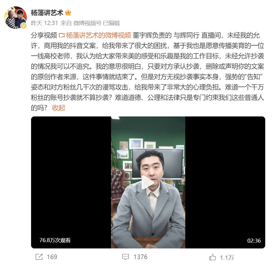 近日,擁有百萬粉絲的人文藝術(shù)博主楊藩發(fā)布視頻稱,“與輝同行”主播董董抄襲自己的視頻文案,再度將董宇輝直播團隊推上熱搜。