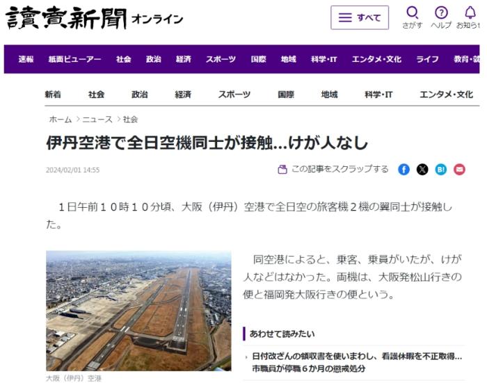 中新網(wǎng)2月1日電 據(jù)日本《讀賣新聞》報(bào)道,當(dāng)?shù)貢r(shí)間2月1日上午10時(shí)10分許,日本大阪伊丹機(jī)場(chǎng)的2架客機(jī)機(jī)翼部位發(fā)生擦碰。