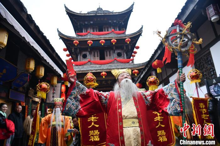 中新網(wǎng)閬中2月4日電 題:走進(jìn)春節(jié)文化之鄉(xiāng):春倌說(shuō)春迎新年 春節(jié)老人賜福忙