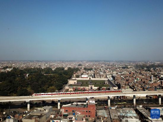 2月2日,在巴基斯坦拉合爾,橙線地鐵列車途徑當?shù)赜斡[勝地夏利瑪花園。新華社發(fā)(艾哈邁德·卡邁勒攝)