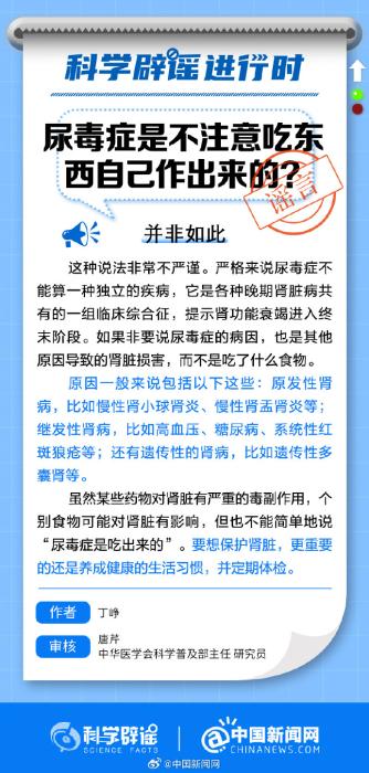 中新網(wǎng)2月7日電 近日有人稱:“中國尿毒癥透析患者已經(jīng)超過100萬了,尿毒癥是不注意吃東西自己作出來的,要想不得尿毒癥,有些食物不能碰……”注意,這些說法沒有科學(xué)依據(jù)!嚴格來說尿毒癥并不能算一種獨立的疾病,它是各種晚期腎臟病共有的一組臨床綜合征,提示腎功能衰竭進入終末階段。如果非要說尿毒癥的病因的話,也是其他原因?qū)е碌哪I臟損害,而不是吃了什么食物。要想保護腎臟,更重要的還是養(yǎng)成健康的生活習(xí)慣,并定期體檢。(來源:@科學(xué)辟謠 中國新聞網(wǎng)微博)