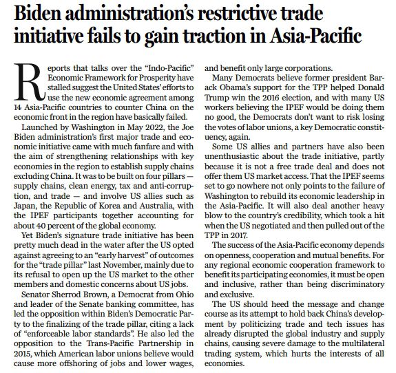 然而,去年11月,受到美國方面態(tài)度的影響,框架“四大支柱”中的“貿(mào)易支柱”談判未能收獲“早期成果”。這主要是因為美國拒絕向其他成員國開放市場,且其國內(nèi)擔憂協(xié)定可能會給就業(yè)帶來影響。由此,IPEF基本上已沒有前途可言。