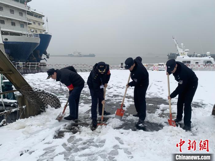 長江海事人員正在鏟冰除雪。長江海事局供圖