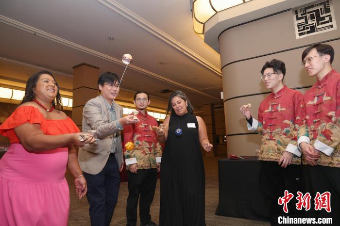 2月8日,曾在香港和國(guó)際賽事中屢獲殊榮的香港劍球(亦稱劍玉)隊(duì)成員(著唐裝者)獲香港駐多倫多經(jīng)貿(mào)處邀請(qǐng)?jiān)L加并出席新春酒會(huì)時(shí),指導(dǎo)與會(huì)嘉賓體驗(yàn)劍球?!≈行律缬浾?余瑞冬 攝