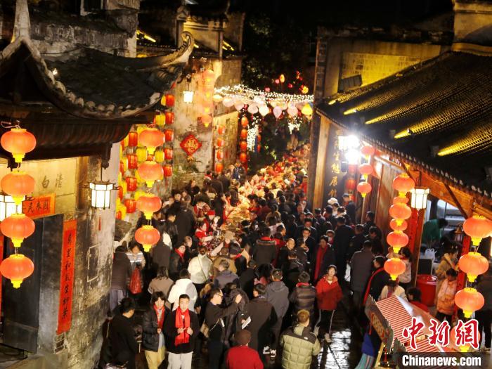 中新網(wǎng)懷化2月10日電 (付敬懿 李林)“開席咯,上頭碗,大吉大利,黃精燉雪峰烏骨雞;第二碗,前程似錦,黔陽雪粑鴨;第三碗,牛氣沖天,干鍋高山黃牛肉;第四碗,年年有余,黃燜昌齡魚……”2月9日晚,除夕夜,湖南懷化洪江市黔陽古城內(nèi),一張張桌子擺滿大街小巷,當(dāng)?shù)鼐用窈陀慰凸矅L長龍宴,歡迎龍年到來。