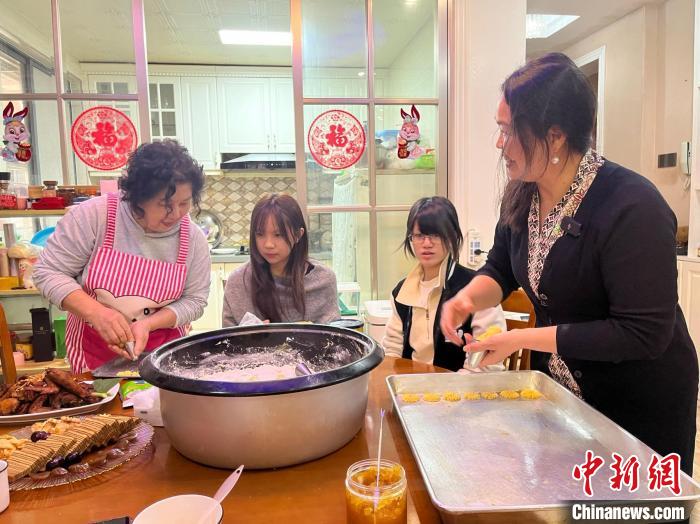 2月5日,蔡蘭妹兒媳婦李月瑤(右一)與家人一起制作印尼糕點。 韋佳秀 攝