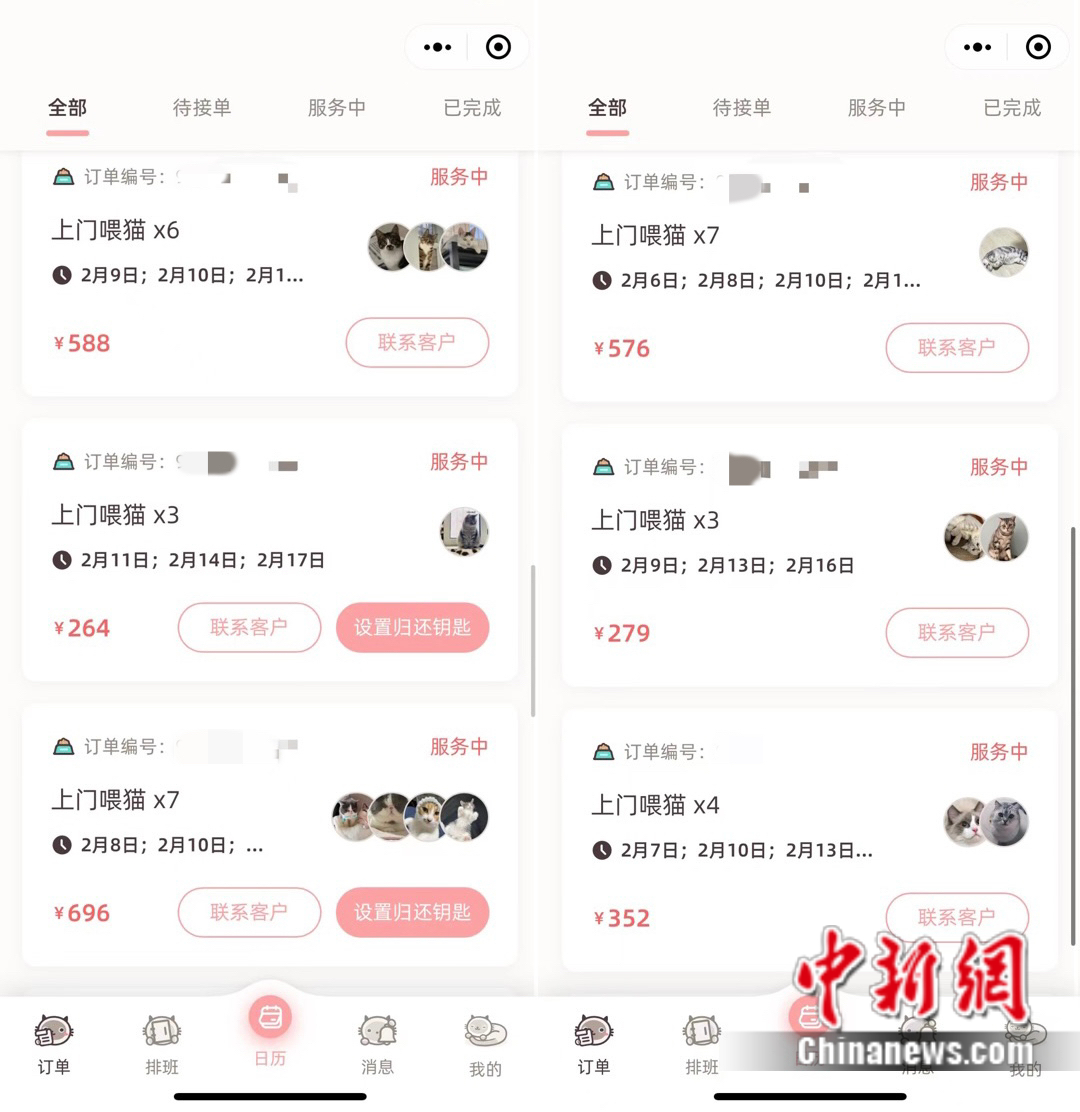 早在兩個月前,池女士就陸續(xù)接到了預(yù)約春節(jié)上門喂養(yǎng)的單子,到了1月底,由于訂單眾多,她不得不封單?!鞍创螖?shù)的話有超過150單了,好幾天都是一天20單?!卑垂?jié)假日平均80/次的價格來算,這個春節(jié)她將收入過萬。
