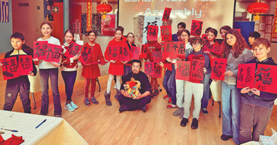在招待會(huì)上,來(lái)賓們?cè)跁ㄕ古_(tái)學(xué)寫“?!弊趾痛郝?lián),在版畫展臺(tái)體驗(yàn)中國(guó)雕版印刷技藝,體驗(yàn)中國(guó)非遺和年俗互動(dòng)項(xiàng)目,了解中國(guó)傳統(tǒng)文化的悠久歷史和傳承發(fā)展等。