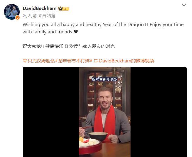 視頻中,貝克漢姆表示,“今年是特別的一年——龍年”,并用中文說道“新春快樂!”隨后,他用筷子吃起了面條。