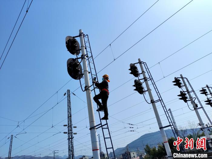 圖為安康東電務(wù)車間職工正在進(jìn)行高柱信號(hào)機(jī)檢修。王建滆攝