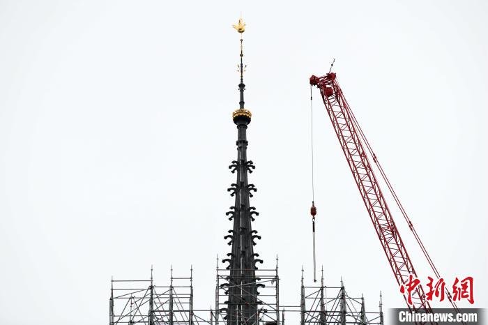 為維修之前遭大火破壞的巴黎圣母院,工人在完全拆除圣母院外墻舊腳手架后,又安裝了大量新的腳手架,特別安裝在受損很嚴重的屋頂和塔尖。自2月12日起,塔尖部分的腳手架被陸續(xù)拆除。安放在塔尖的公雞風(fēng)向標曾被腳手架包圍起來,人們一度難以目睹其外觀。而在2月13日,它基本展露在世人面前。
