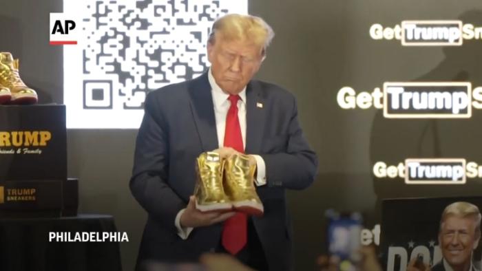 據(jù)報道,特朗普當(dāng)天在費城會議中心舉行的球鞋展會上,手持一雙金色的“特朗普”牌球鞋進行展示。