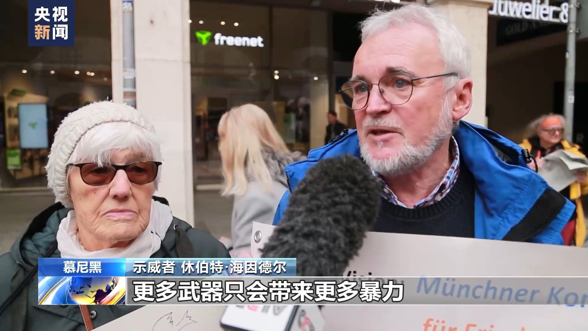 示威者 休伯特·海因德爾:更多武器只會(huì)帶來更多暴力,以暴制暴,我們希望通過抗議呼吁慕安會(huì)的(西方國家)與會(huì)人士擺脫軍事思維和手段,用和平思維來解決沖突。