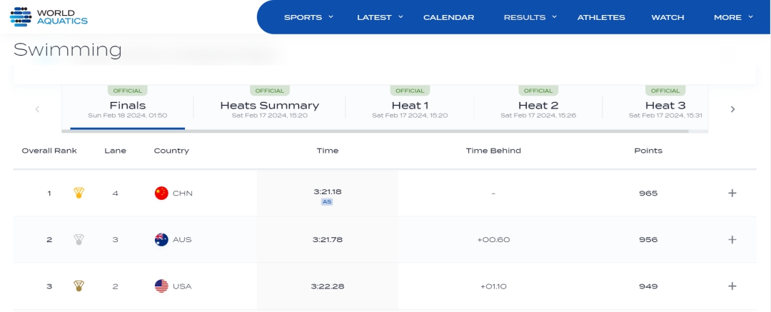 在預(yù)賽中,中國隊(duì)便狀態(tài)不俗,游出了3分24秒47的成績,打破了由日本隊(duì)保持的亞洲紀(jì)錄(3分24秒67),排名第一晉級(jí)決賽。