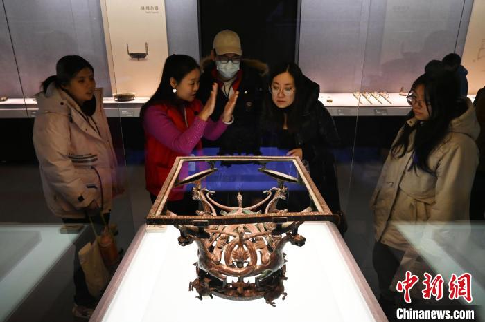 2月6日,民眾在河北博物院“戰(zhàn)國雄風 古中山國”展廳參觀錯金銀四龍四鳳銅方案座?!≈行律缬浾?翟羽佳 攝