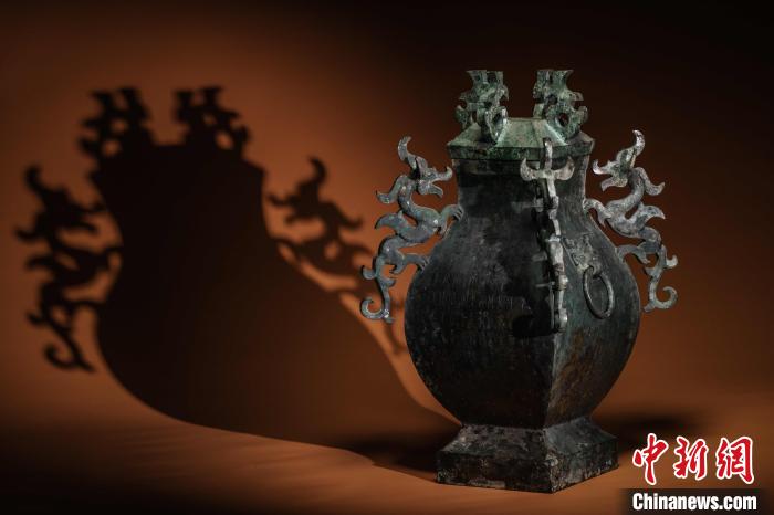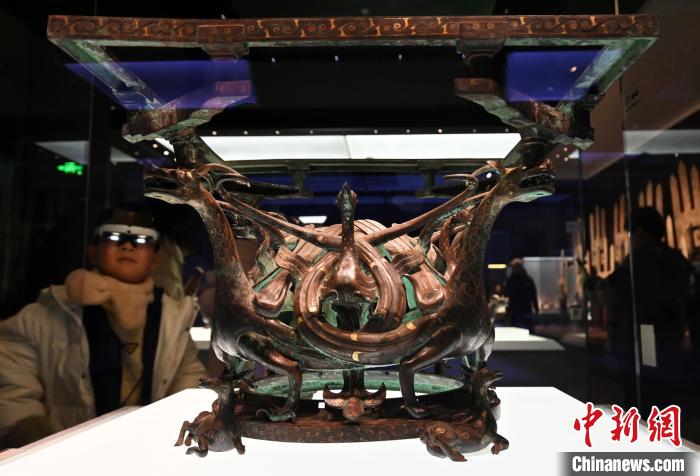 因年代久遠,錯金銀四龍四鳳銅方案座的案面已朽,但案座依然十分精美。 中新社記者 翟羽佳 攝
