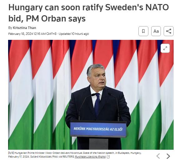 中新網(wǎng)2月18日電 據(jù)路透社報(bào)道,當(dāng)?shù)貢r(shí)間17日,匈牙利總理歐爾班·維克托在一次演講中表示,匈牙利議會(huì)可能在2月晚些時(shí)候召開的春季會(huì)議上,批準(zhǔn)瑞典加入北約。