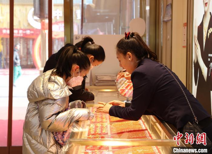 2024年2月,市民在商場內(nèi)選購黃金飾品?!≈行律缬浾?于晶 攝