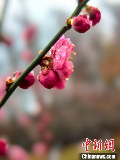 晶瑩的水滴為燦爛的梅花中增加了點點浪漫。(中新網記者陳靜攝)