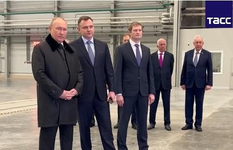 當(dāng)?shù)貢r間2月21日,俄總統(tǒng)普京視察喀山飛機(jī)制造廠。圖片來源:塔斯社視頻截圖