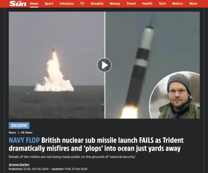 自1994年“三叉戟II”型導(dǎo)彈進(jìn)入英國(guó)皇家海軍服役以來(lái),英國(guó)已發(fā)射了12枚該導(dǎo)彈。但最后發(fā)射的兩枚都失敗了。2016年6月,一枚“三叉戟II”導(dǎo)彈從英國(guó)皇家海軍“復(fù)仇”號(hào)核潛艇上發(fā)射升空,其推進(jìn)器成功點(diǎn)火,但不久之后導(dǎo)彈就偏離了飛行路線,最終啟動(dòng)了自毀程序。據(jù)稱,該導(dǎo)彈每枚的成本高達(dá)1700萬(wàn)英鎊。