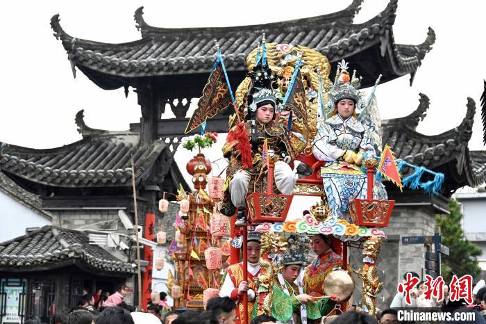 中新網(wǎng)寧波2月23日電 (方堃 蔣攀 駱佳明 葛鵬超)2月23日正值農(nóng)歷正月十四,浙江省寧波市寧??h前童鎮(zhèn)鼓亭館廣場上,人聲鼎沸,熱鬧非凡,一場延續(xù)百年的民俗活動(dòng)“前童元宵行會(huì)”在這里舉行。