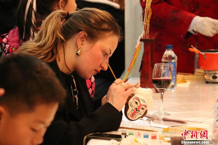 表演結(jié)束后,主辦方還準(zhǔn)備了迷你廟會體驗活動,畫臉譜、吹糖人等傳統(tǒng)民俗活動吸引了眾多法國青少年圍觀?!拔覑壑袊 彼麄儽硎?,雖然來到中國的時間尚短,但已經(jīng)感受到中國文化的魅力。