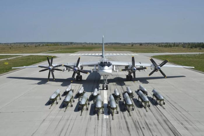 俄一架圖-95MS轟炸機(jī)前擺放著14枚導(dǎo)彈。圖片來(lái)源:俄羅斯國(guó)防部