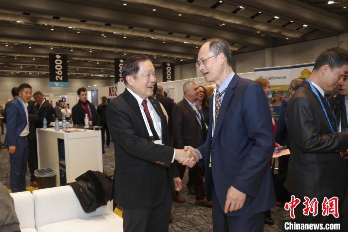 當(dāng)?shù)貢r(shí)間3月3日,2024年加拿大國際礦業(yè)大會(PDAC)在多倫多揭幕。圖為加拿大聯(lián)邦參議員胡子修(左)與參展中國企業(yè)紫金礦業(yè)集團(tuán)股份有限公司副總裁沈紹陽交流。中新社記者 余瑞冬 攝