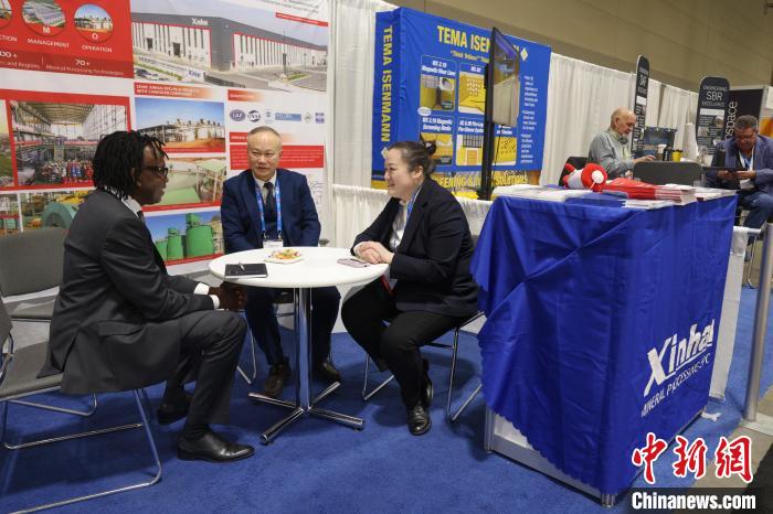 當(dāng)?shù)貢r(shí)間3月3日,2024年加拿大國際礦業(yè)大會(PDAC)在多倫多揭幕。圖為中國企業(yè)山東鑫海礦業(yè)技術(shù)裝備股份有限公司參展代表與客商洽談。中新社記者 余瑞冬 攝