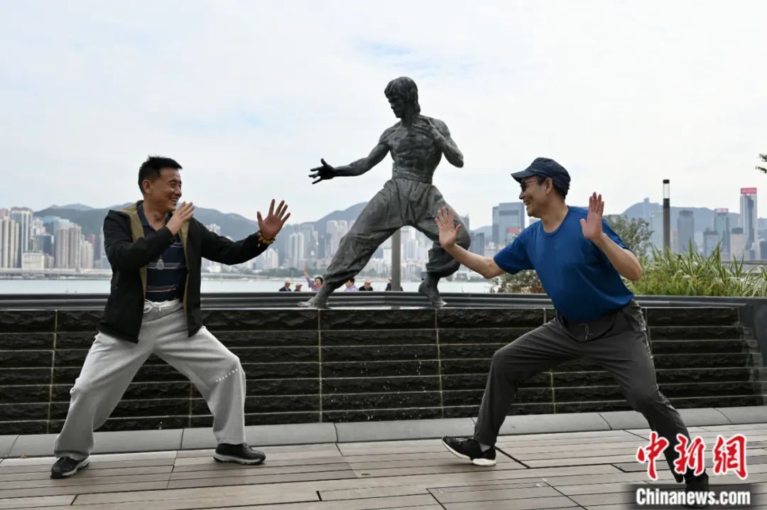 2023年11月,香港,游客擺出李小龍銅像的姿勢合影。李志華 攝