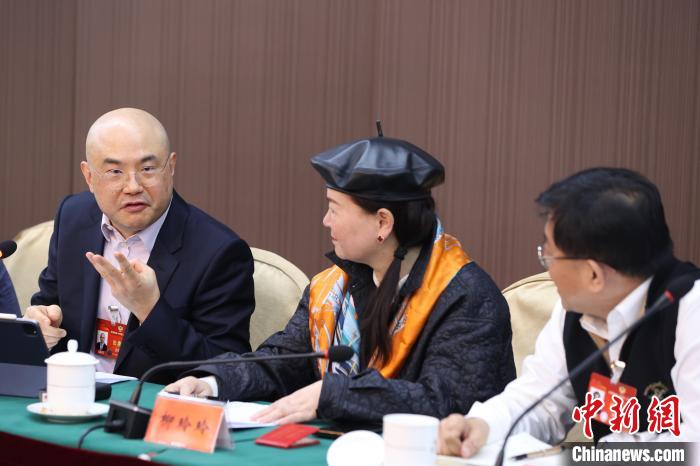 3月5日,全國(guó)政協(xié)十四屆二次會(huì)議僑聯(lián)界小組會(huì)議在北京舉行。圖為全國(guó)政協(xié)委員柳玲玲(中)和全國(guó)政協(xié)委員洪明基(左)。中新社記者 蔣啟明 攝