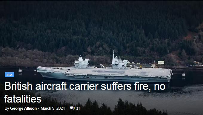 中新網(wǎng)3月10日電 據(jù)英國“UKDefenceJournal”網(wǎng)站、英國《獨立報》等多家英國媒體當?shù)貢r間9日報道,停靠在蘇格蘭格倫馬蘭的英國航空母艦“伊麗莎白女王”號發(fā)生火災。目前尚無人員傷亡報告。