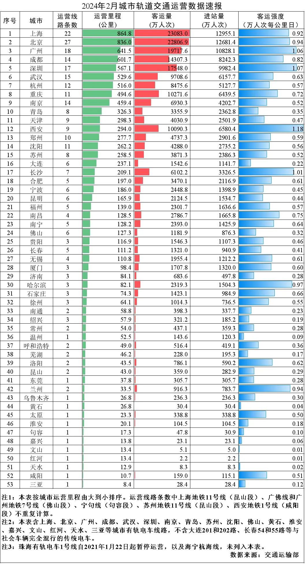 中新網(wǎng)3月12日電 據(jù)交通運(yùn)輸部微信公眾號(hào)消息,2024年2月,31個(gè)省(自治區(qū)、直轄市)和新疆生產(chǎn)建設(shè)兵團(tuán)共有55個(gè)城市開通運(yùn)營(yíng)城市軌道交通線路308條,運(yùn)營(yíng)里程10205.6公里,實(shí)際開行列車317萬(wàn)列次,完成客運(yùn)量20.5億人次,進(jìn)站量12.4億人次。2月份,客運(yùn)量環(huán)比減少6.1億人次,降低22.9%,同比減少1.3億人次,降低6%。2月份全國(guó)總運(yùn)營(yíng)里程的平均客運(yùn)強(qiáng)度為0.693萬(wàn)人次每公里日,環(huán)比降低17.6%,同比降低14.4%。本月無(wú)新開通線路。