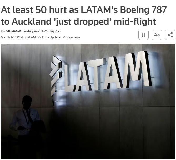 當時, 總部位于智利的拉塔姆航空公司一架從澳大利亞悉尼飛往新西蘭奧克蘭的波音飛機,因技術問題,在飛行途中急降,“劇烈俯沖”數(shù)秒,導致乘客撞上機艙頂,造成至少50人受傷。