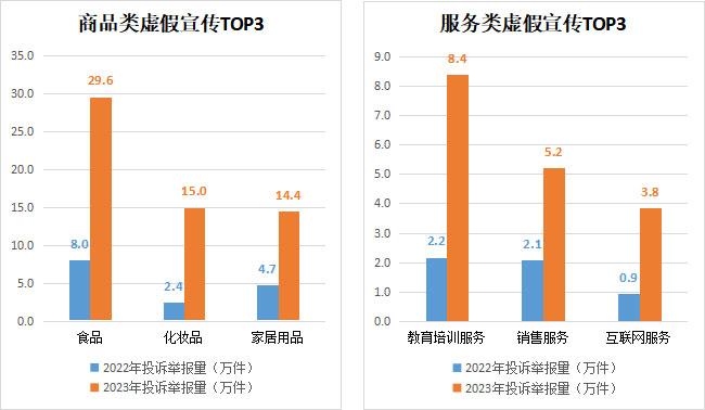 消費(fèi)者在購物時(shí)會(huì)接觸到各種各樣的宣傳信息,但海量的宣傳信息并非都是真實(shí)可信的,一些商家以夸大其詞、隱瞞真相等手段,誘使消費(fèi)者做出錯(cuò)誤的消費(fèi)選擇。2023年,全國12315平臺(tái)接收虛假宣傳投訴舉報(bào)144.3萬件,同比增長1.7倍。從商品服務(wù)類別來看,商品類別中虛假宣傳投訴舉報(bào)較多的有食品(29.6萬件)、化妝品(15萬件)、家居用品(14.4萬件);服務(wù)類別中虛假宣傳投訴舉報(bào)較多的有教育培訓(xùn)服務(wù)(8.4萬件)、銷售服務(wù)(5.2萬件)、互聯(lián)網(wǎng)服務(wù)(3.8萬件)。消費(fèi)者反映的問題主要集中在商家虛構(gòu)產(chǎn)品效果、夸大產(chǎn)品優(yōu)勢(shì),通過“好評(píng)返現(xiàn)”提高虛假聲譽(yù),誤導(dǎo)消費(fèi)者購買等。