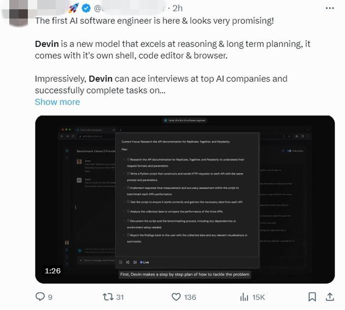 “第一位AI工程師看起來很有希望,令人印象深刻的是,Devin可以在頂級(jí)AI公司的面試中脫穎而出,并且成功地完成了任務(wù)?!庇腥斯ぶ悄軐<以谏缃黄脚_(tái)分享觀點(diǎn)。多個(gè)Devin編程的視頻也在網(wǎng)絡(luò)流傳。