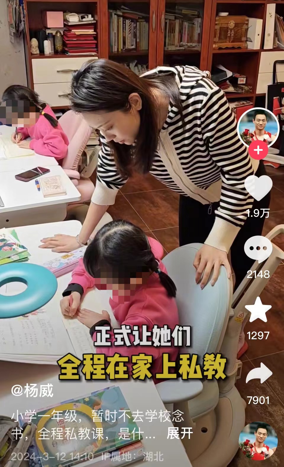 近日,體操奧運冠軍楊威在社交平臺發(fā)布視頻稱,由于去年兩個女兒連生好幾場病后,他跟妻子楊云做了個大膽嘗試,讓上一年級的兩個女兒暫時不去學校念書,全程在家上私教。