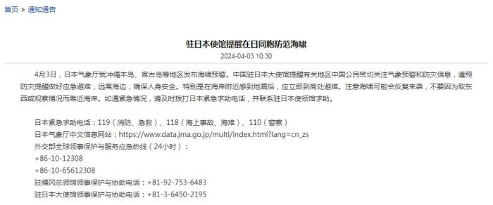 中新網(wǎng)4月3日電 據(jù)中國駐日本大使館官網(wǎng)消息,4月3日,日本氣象廳就沖繩本島、宮古島等地區(qū)發(fā)布海嘯預(yù)警。中國駐日本大使館提醒有關(guān)地區(qū)中國公民密切關(guān)注氣象預(yù)警和防災(zāi)信息,遵照防災(zāi)提醒做好應(yīng)急避難,遠離海邊,確保人身安全。特別是在海岸附近感到地震后,應(yīng)立即到高處避難。注意海嘯可能會反復(fù)來襲,不要因為取東西或觀察情況而靠近海岸。如遇緊急情況,請及時撥打日本緊急求助電話,并聯(lián)系駐日本使領(lǐng)館求助。