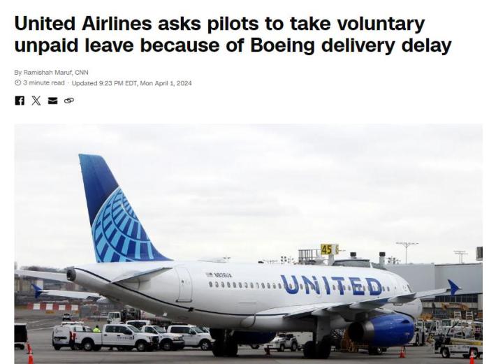 據(jù)美國消費(fèi)者新聞與商業(yè)頻道(CNBC)報(bào)道,美聯(lián)航證實(shí)了無薪休假的請求。該航空公司此前還表示,由于波音公司的飛機(jī)延遲交付,它將在2024年春天暫停招聘飛行員。