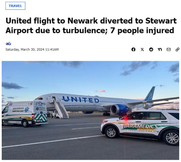 中新網(wǎng)3月30日電 據(jù)美國廣播公司(ABC)報道,當?shù)貢r間29日,美聯(lián)航一航班在準備降落時因大風“極度顛簸”,致機上多名乘客受傷,7人被送往醫(yī)院治療,該航班隨后緊急改道備降至紐約斯圖爾特國際機場。