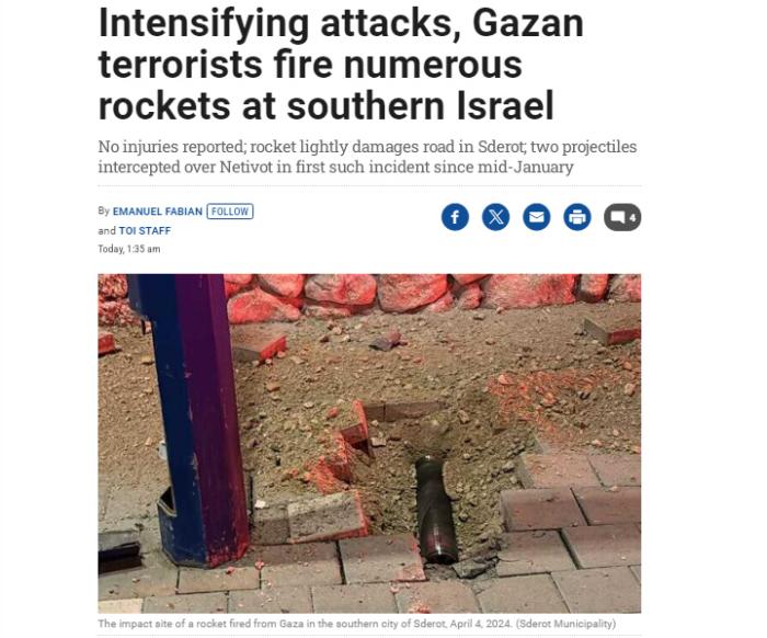 中新網(wǎng)4月5日電 據(jù)《以色列時(shí)報(bào)》報(bào)道,當(dāng)?shù)貢r(shí)間4日晚,以色列國(guó)防軍表示,以色列南部城市斯代羅特遭加沙地帶發(fā)射的兩枚火箭彈襲擊。