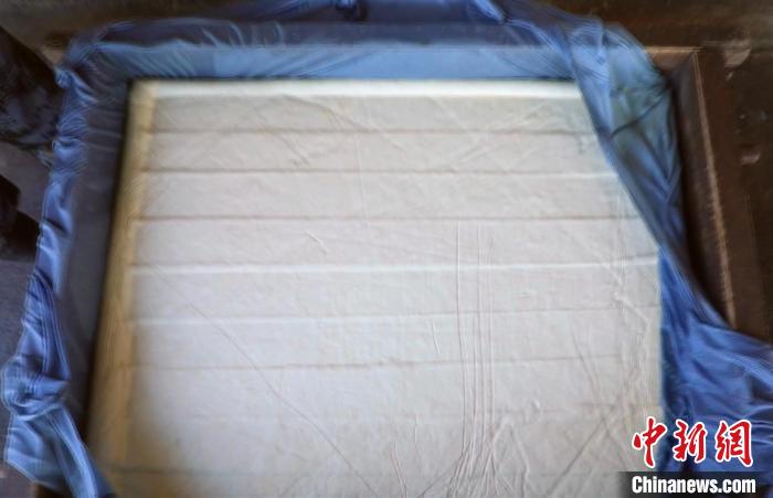 豆?jié){與石膏相遇,化學反應后,豆香味縈繞在鼻尖,香氣彌漫在空氣中。這時,王志勇蓋上空隙均勻的木頭壓板,壓上石墩子,讓豆腐腦中的水分通過籠布和蓋板上的洞流走,等待豆腐壓好成型。